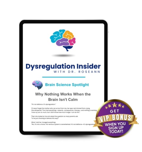 Parenting a dysregulated child can feel overwhelming — but you don’t have to do it alone. Start with our Dysregulation Insider Newsletter for weekly science-backed strategies, then use our 3-minute Solution Matcher to discover your child’s next best step.